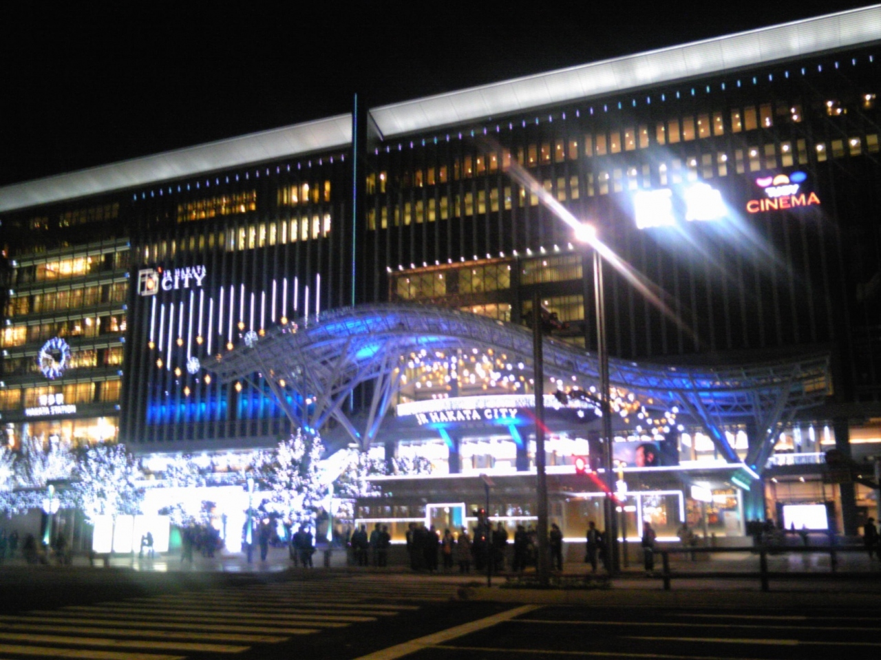 ジェイアール博多駅の駅前に年末からライトアップされるイルミネーション。駅前広場にLEDの照明が青と白を中心に街路樹を飾り、輝きが大変きれいで、博多阪急、アミュプラザの建物の照明と合わせて年末年始のムードを盛り上げます。