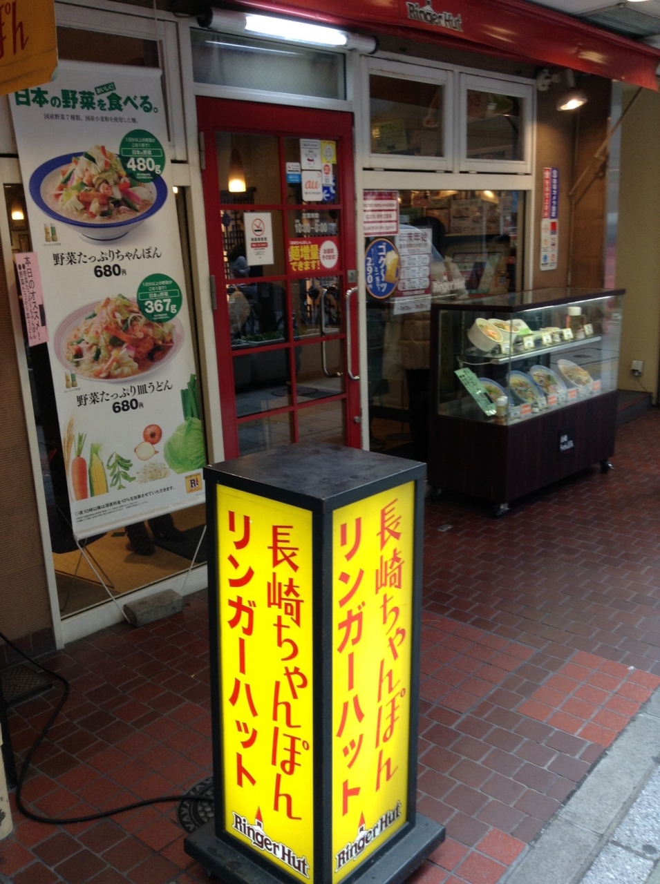 居抜きの店舗なのかリンガーハットらしからぬ内装です。ペンライトが天井からぶら下がっています。