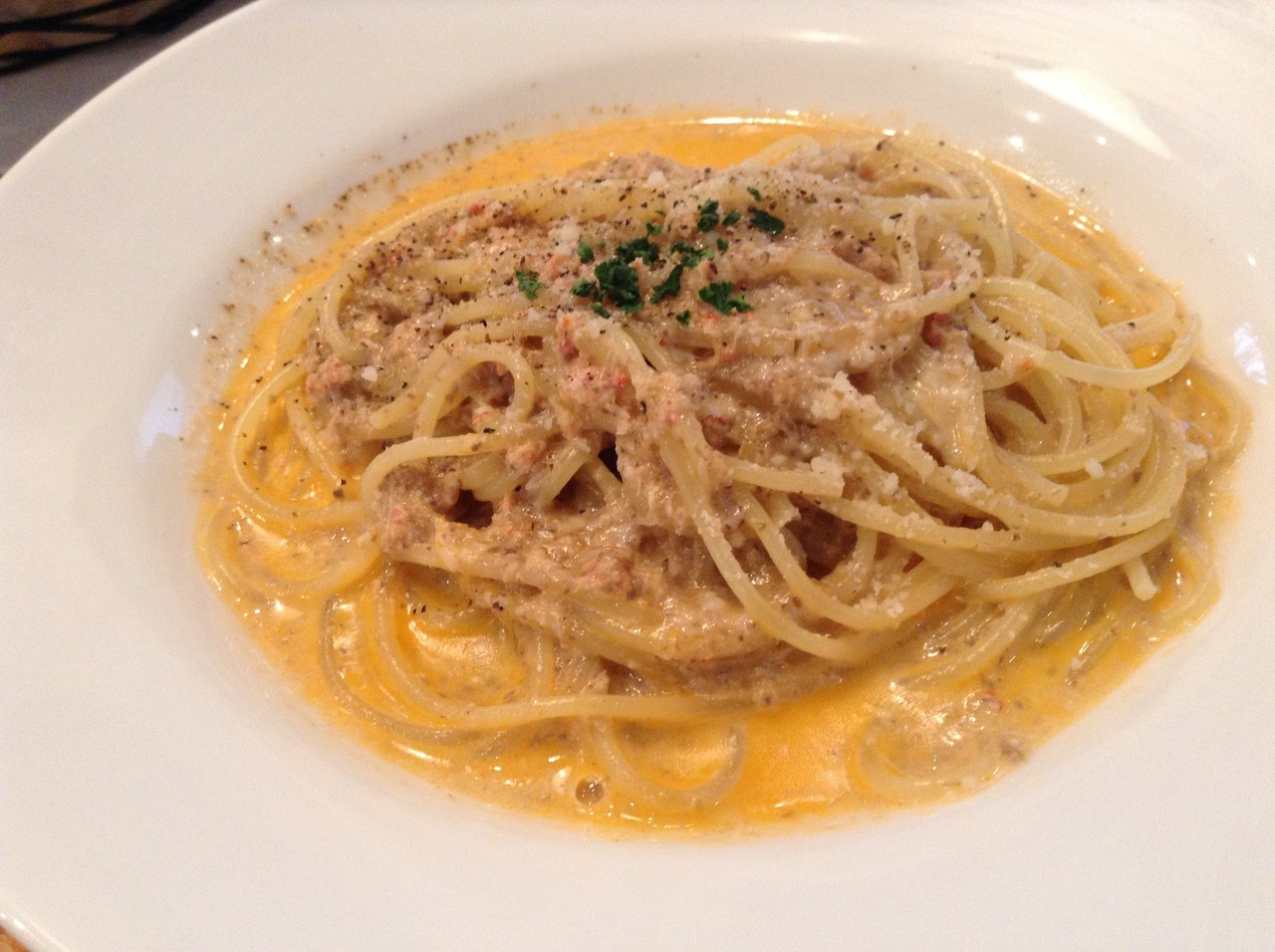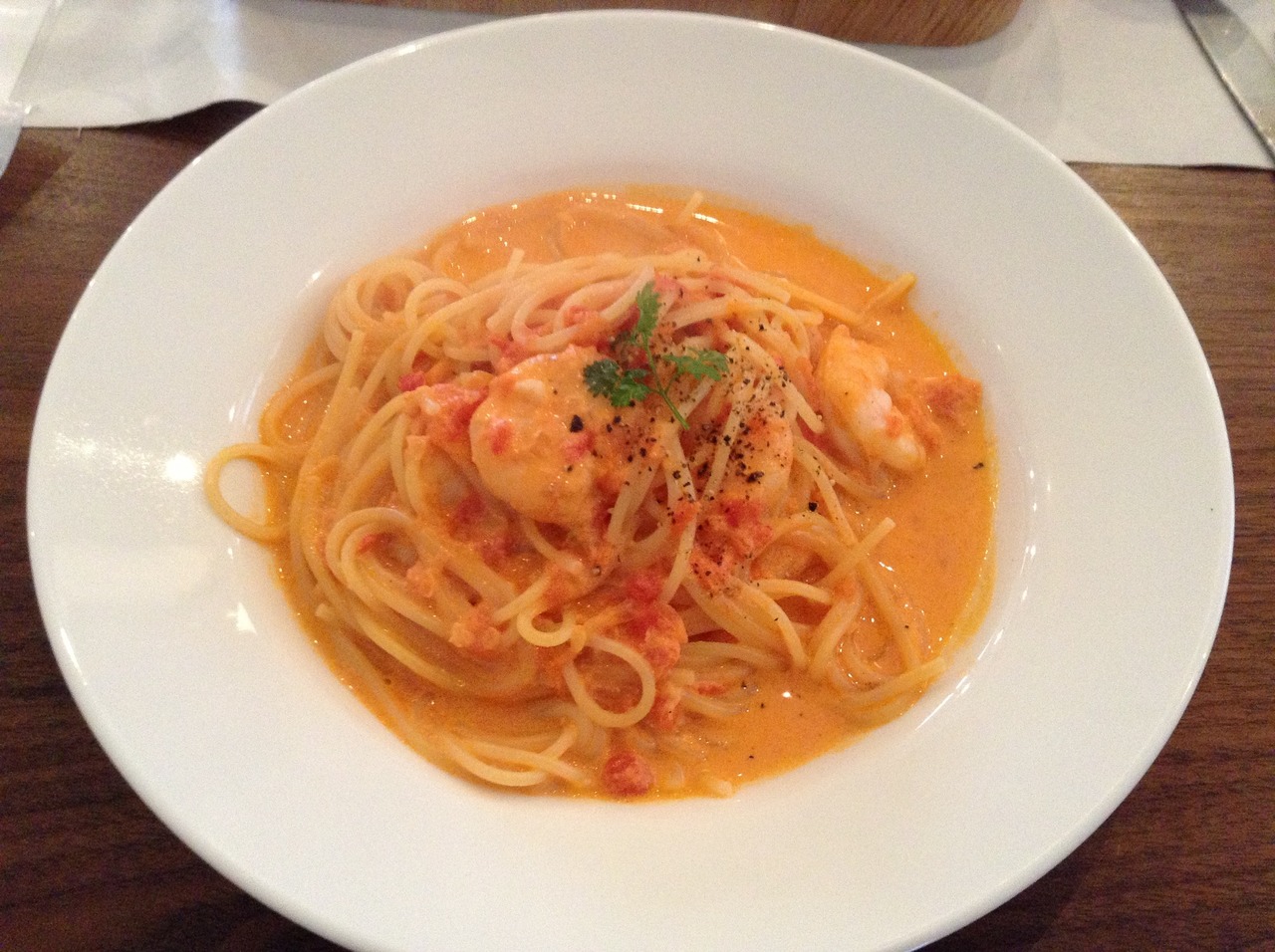 今回はランチで利用しました。パスタセット1300円を注文。パスタは四種類から選べます。海老のトマトクリームパスタを選択。