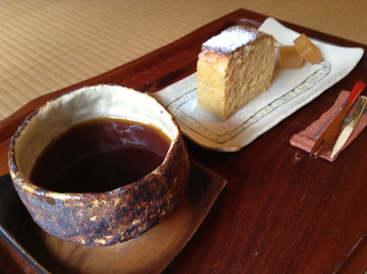 コーヒーとお菓子のセット700円を注文。お菓子は、おからのパウンドケーキで、甘すぎずコーヒーによく合います。コーヒーは、普段はブラックは飲まないのですが、今回は砂糖も入れずにいただきました。濃過ぎず、美味しかったです。