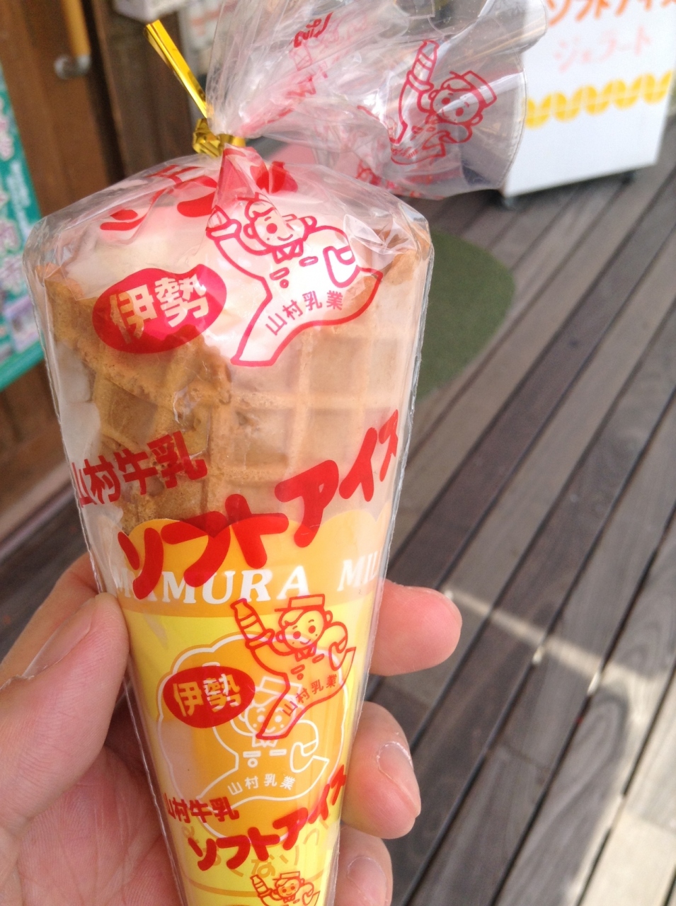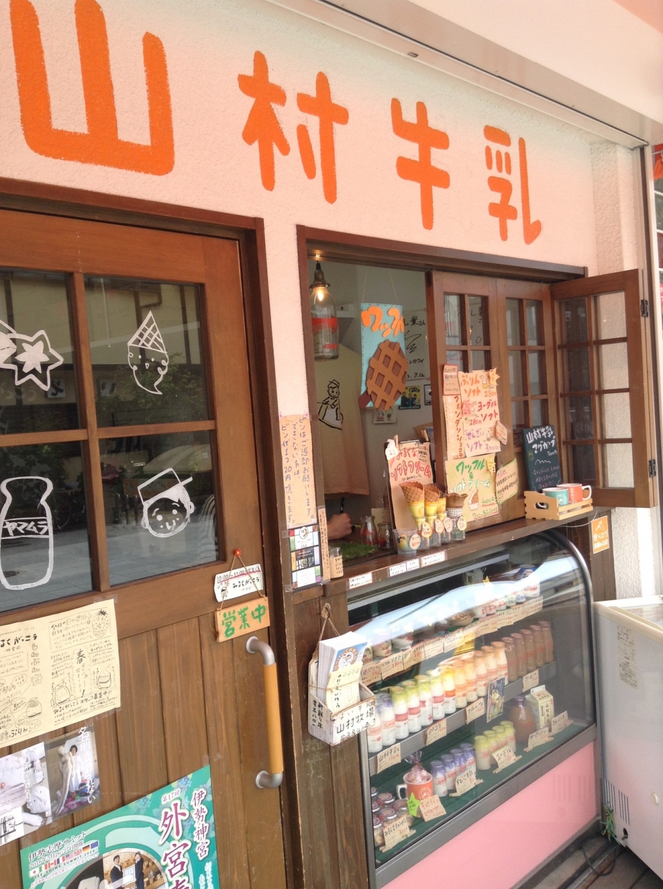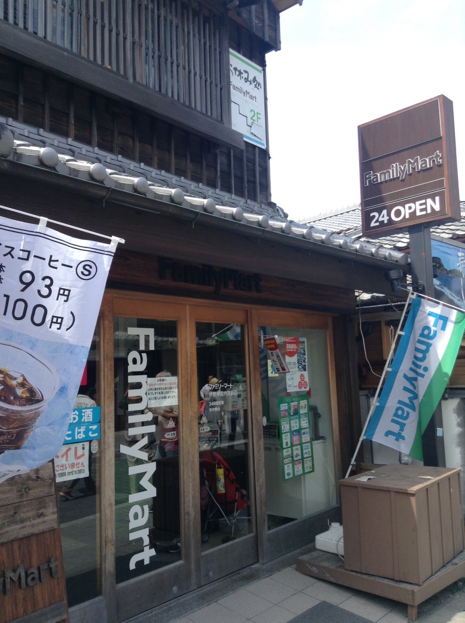 伊勢神宮の内宮の参道にあるファミリーマート。外観が参道の雰囲気に合うように、イメージカラーの緑ではなく、茶色系統でまとめらています。店内は普通のファミリーマートですが、二階があり、イートインで休憩できるようになっています。
