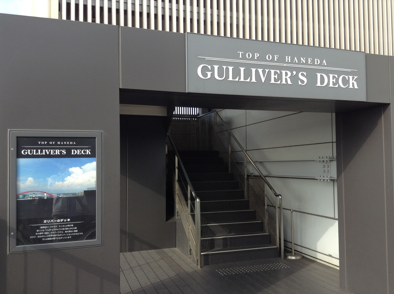 ガリバーズデッキは、羽田空港第一ターミナルの6階にある展望デッキから更に階段を上った所にあります。ウッドデッキで360度見渡せるようになっていて飛行機、滑走路、第二ターミナル、遠くは東京都内の品川辺りから先の景色がよく見えます。