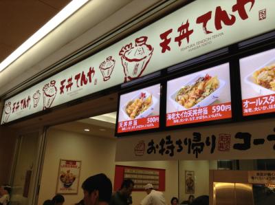 いわずと知れた天丼のてんやは、羽田空港第一ターミナルの地下一階にあります。建物の中央にあるエレベーターの裏側なので、わかりにくいかもしれません。