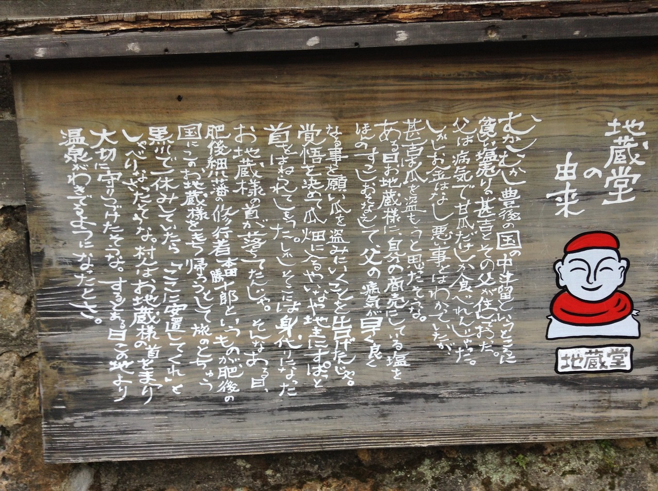 案内によると、昔、病気の父に瓜を食べさせようと畑に盗みに入った男の身代わりとなり、地主に首をはねられた地蔵があった。この地蔵の首を細川藩の修行僧が熊本に持ち帰ろうとした時、 「この地に安置してくだされ」と喋った為に現在の場所に祭ったと伝わっている。その後、黒川温泉が湧き出すようになったのだとか。