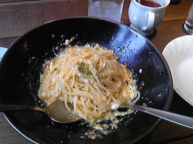 著名人も数多く来店している大濠公園近くのパスタ屋さん。店内には野球選手のユニホームなどが飾られている。平日の昼ですが、並んで入店し、店内でも多少待ちました。混んでいるせいか相席で落ち着いては食べられませんでした。味は生パスタでおいしいです。ペペロンチーノに卵を絡めた1番人気(?)「ぺぺたま」を注文しました。他にもメニュー種類は多くて注文時迷います。