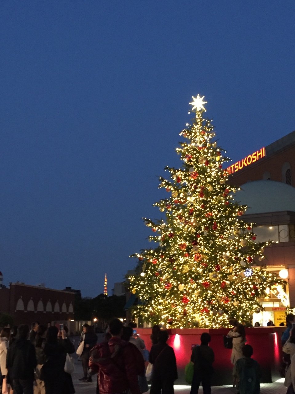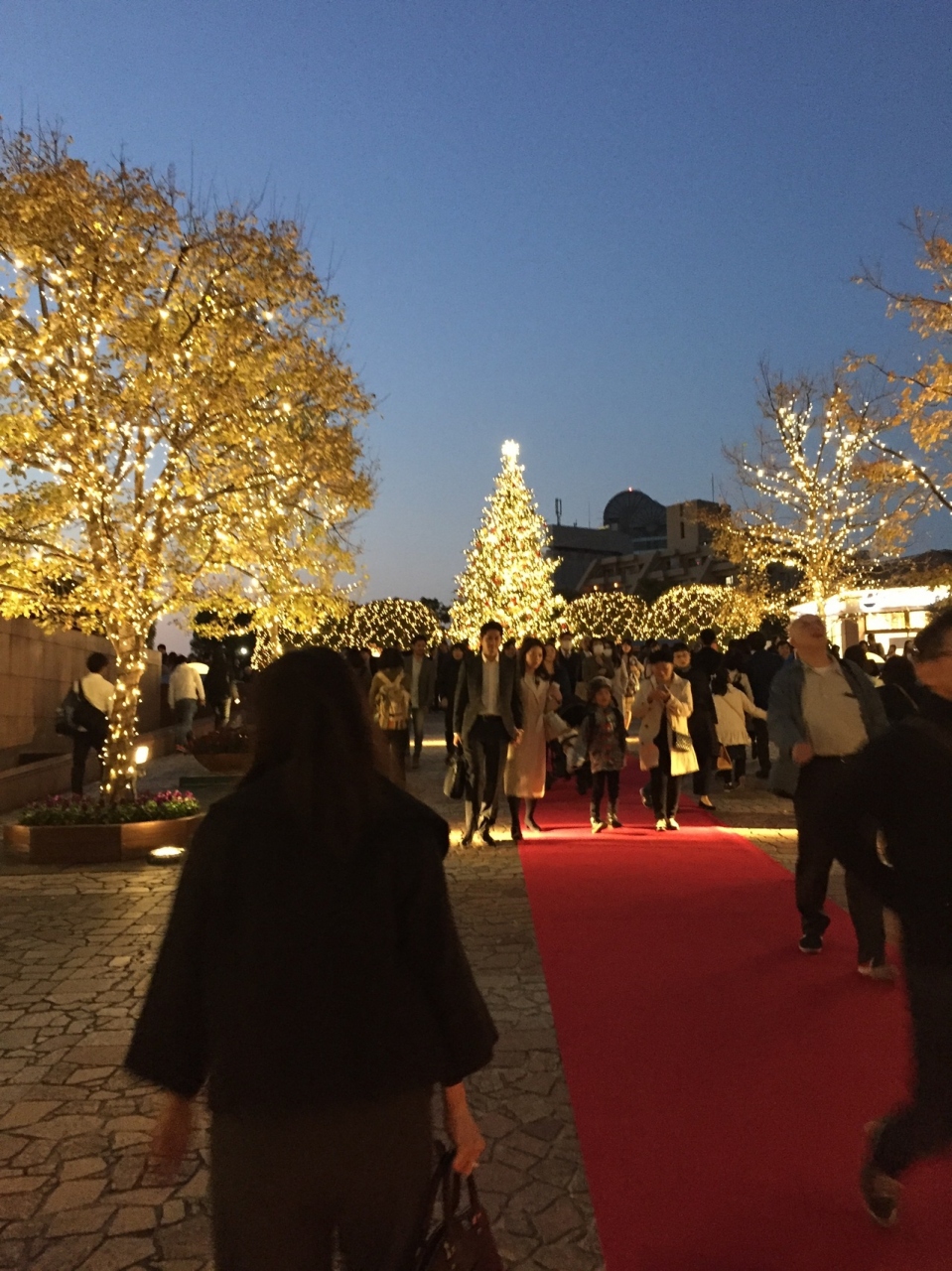 東京タワーをバックに、とても王道なツリーが映えます。ガーデンプレイスからツリーまで赤い絨毯、少し上り坂なので、ツリーを見上げるような形で、よりツリーが大きく見えます。また、バカラのシャンデリアがゴージャス!