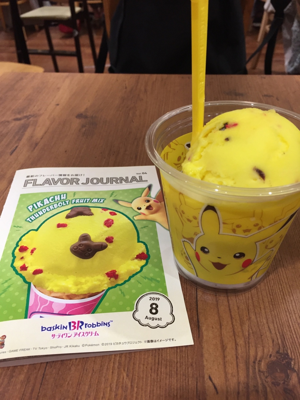 写真は、ピカチュウThunderbolt fruit MIX味のポケモンカップ入り。カップは、3つの柄から選べますが、スプーンはどの形になるかは、お楽しみ。