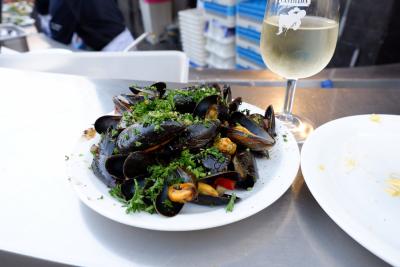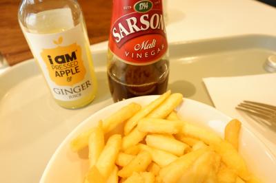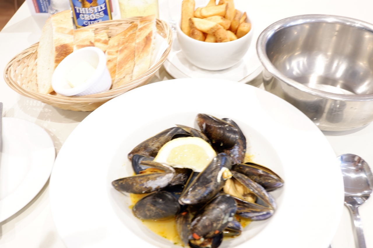 ランチでは、通常の1ポットのハーフサイズの量のムール貝、ポテトフライ、バゲットのセットで6.95ポンドとお手頃ですが、バゲットがあるからお腹いっぱいになったものの、貝の量だけみれば、物足りないかもです。貝だけなら1ポット軽く平らげられるので奮発しても1ポットにした方が満足感得られるかと。味付けは私はニンニクきいたスパイシーなモロッカンソースにしましたが、シンプルな塩味の他にも数種類の味付けあったかと思います。ランチセットお手頃でもドリンクも頼めば、11.35ポンドになりました。英国の外食はどこも高くつきます。