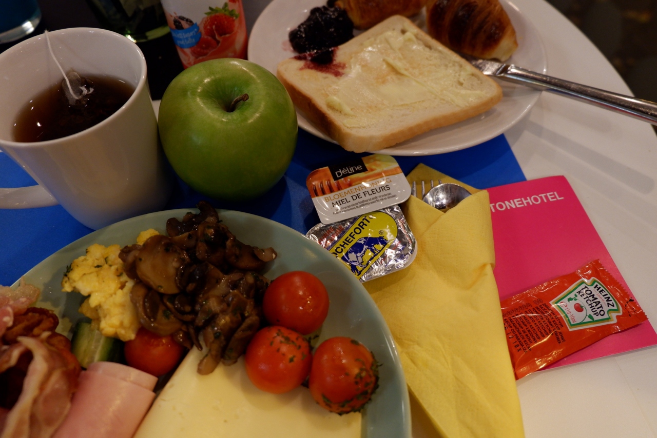 小さいながらロビー、朝食会場、そして朝食の果物、紅茶やコーヒーのカプセル、ナプキン…隅々までパントーン意識したカラフルさ。コールドミールながら満足の朝食内容。