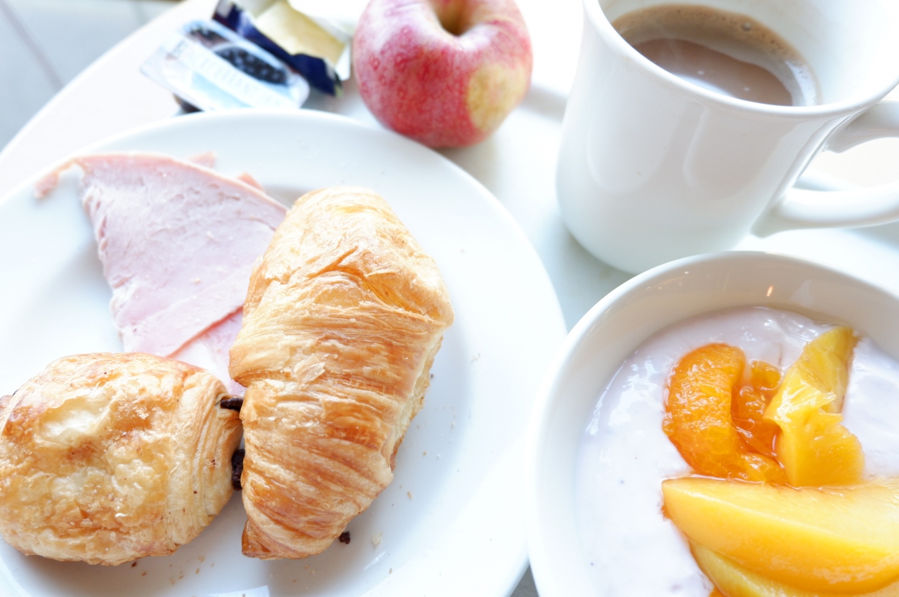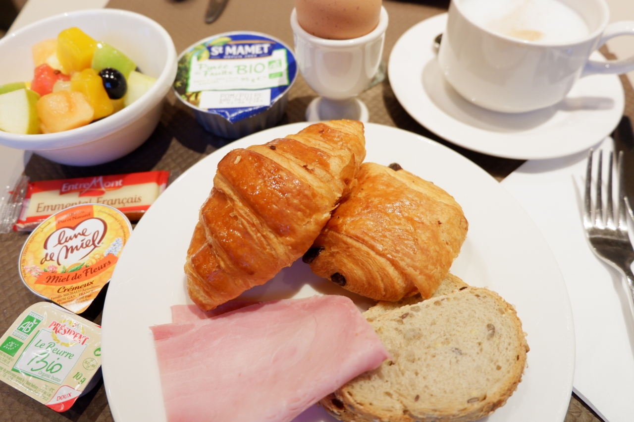 ・クロワッサン、バゲット、チョコデニッシュ、マドレーヌ他数種のパン、ハム、チーズ、果物、ヨーグルト、シリアル、カフェオレ、紅茶、ジュース、牛乳等数種のドリンク...セルフサービスのコンチネンタルブレックファーストも美味しく、朝早くからやっていて便利。
