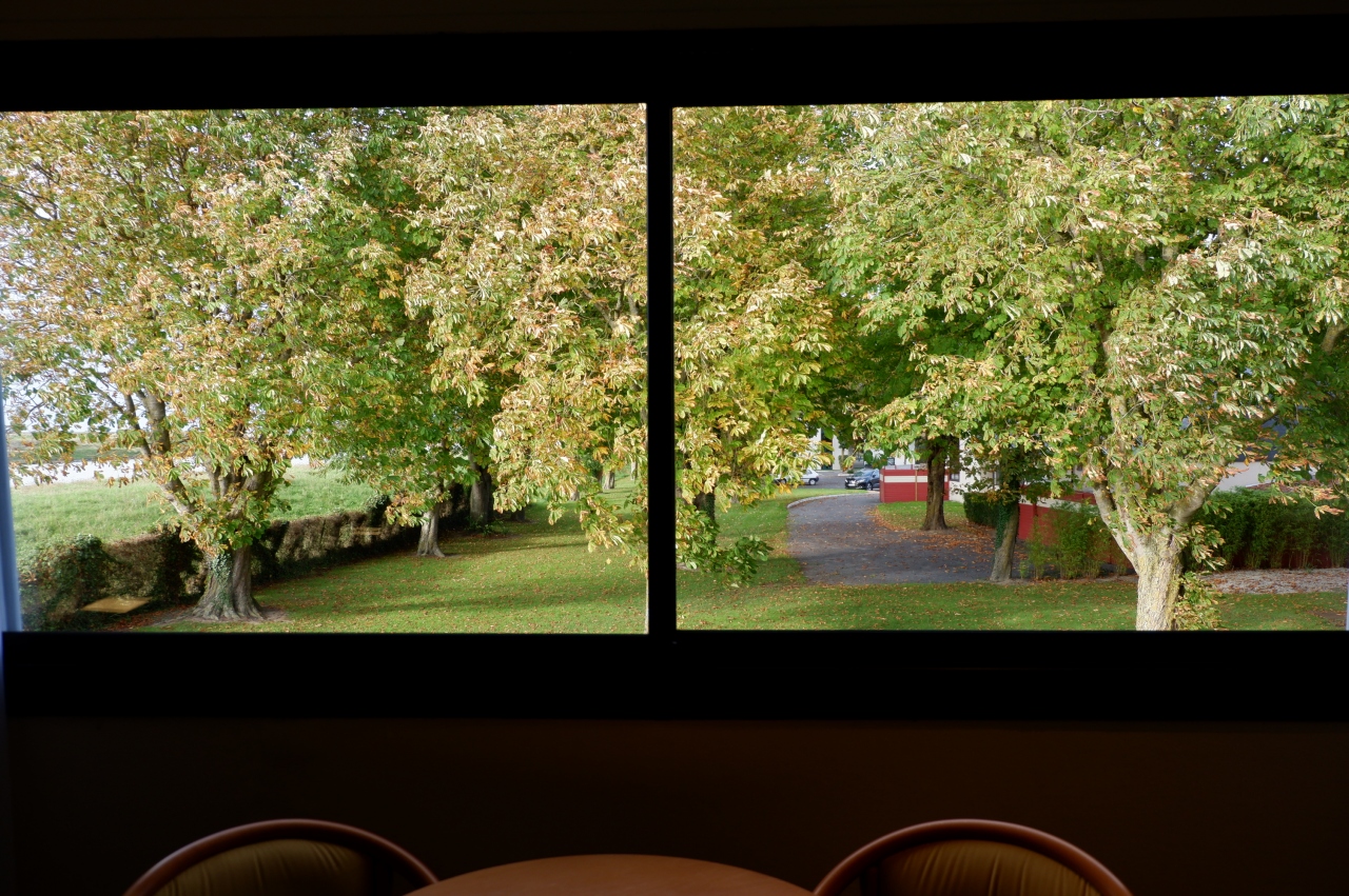 部屋からモンサンミッシェルは見えません。でも部屋にもよると思いますが、私の部屋の大きな窓からは、紅葉した裏庭の人通りのない静かな並木道が一面にピクチャーウインドウのように見られ気持ちよかったです。