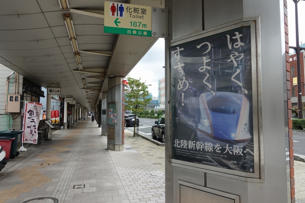 広い道の両側は無料駐車場と化していて、ちょっともったいない気も。雪の時期には、貯雪場になるのかもしれません。アーケードに仕込まれた情報ビジョンは停止中。広告看板は新幹線の大阪延伸を求めるものばかりで、街の思いは伝わってきましたが、商いとして賑わっているわけではないようでした。- 旅行時期