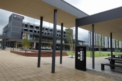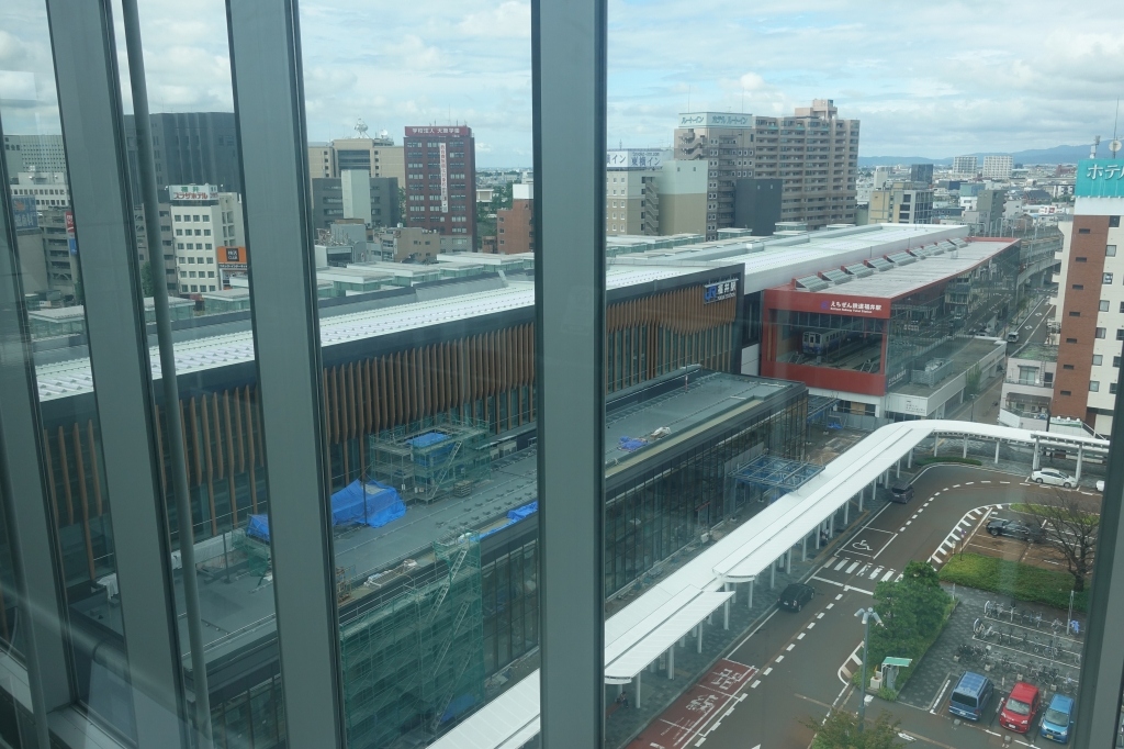 福井駅の新幹線口にそびえる、公共施設と商業施設の複合ビルです。在来線口にも大きな再開発ビルがあるのに、新幹線開業を前にして駅前再開発の勢いがとてつもないです。