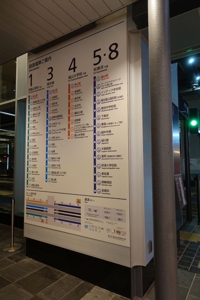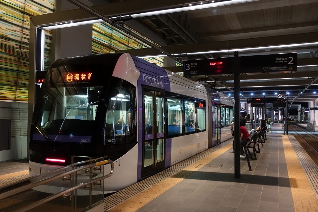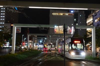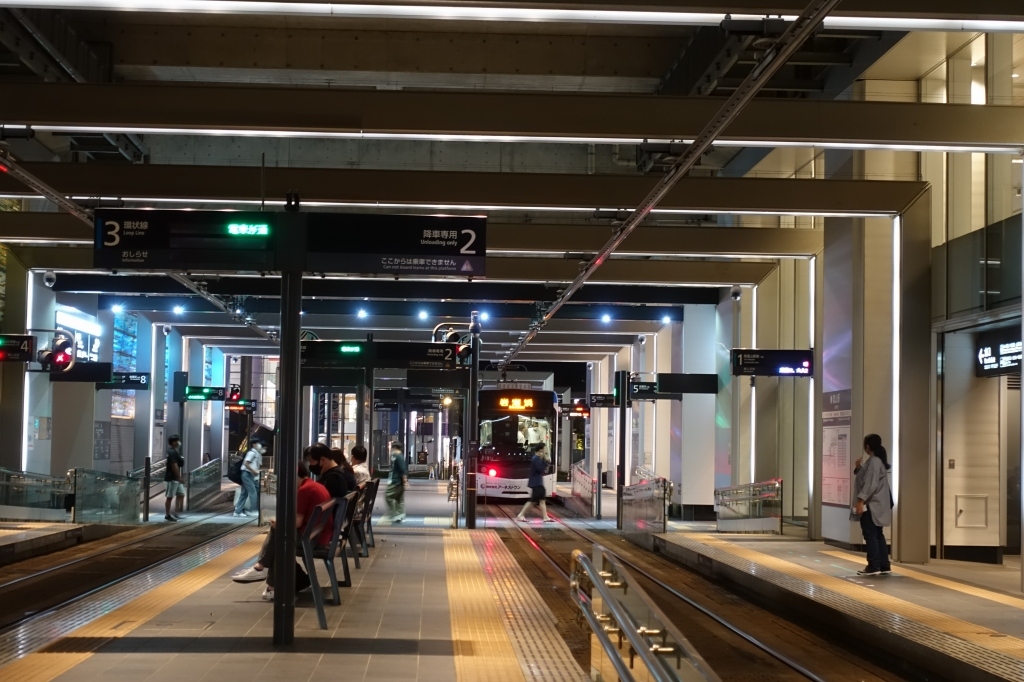 系統も多岐に渡ることから、富山駅コンコースに直結した電停には、なんと8番線まで乗り場があります。壁面がライトアップされた電停は、高架下の暗さなど微塵も感じません。駅の前後は架線柱に照明が仕込まれ、美しい都市景観を演出していました。夜まで乗客が多く、都市型生活を送る市民に頼られる足です。- 旅行時期