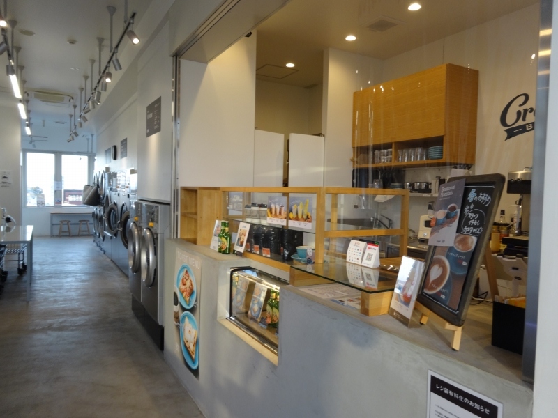 コインランドリーに併設された、ユニークなカフェ。ビルの1~4階はトランクルームで、コインランドリーは5階というのも変わっています。