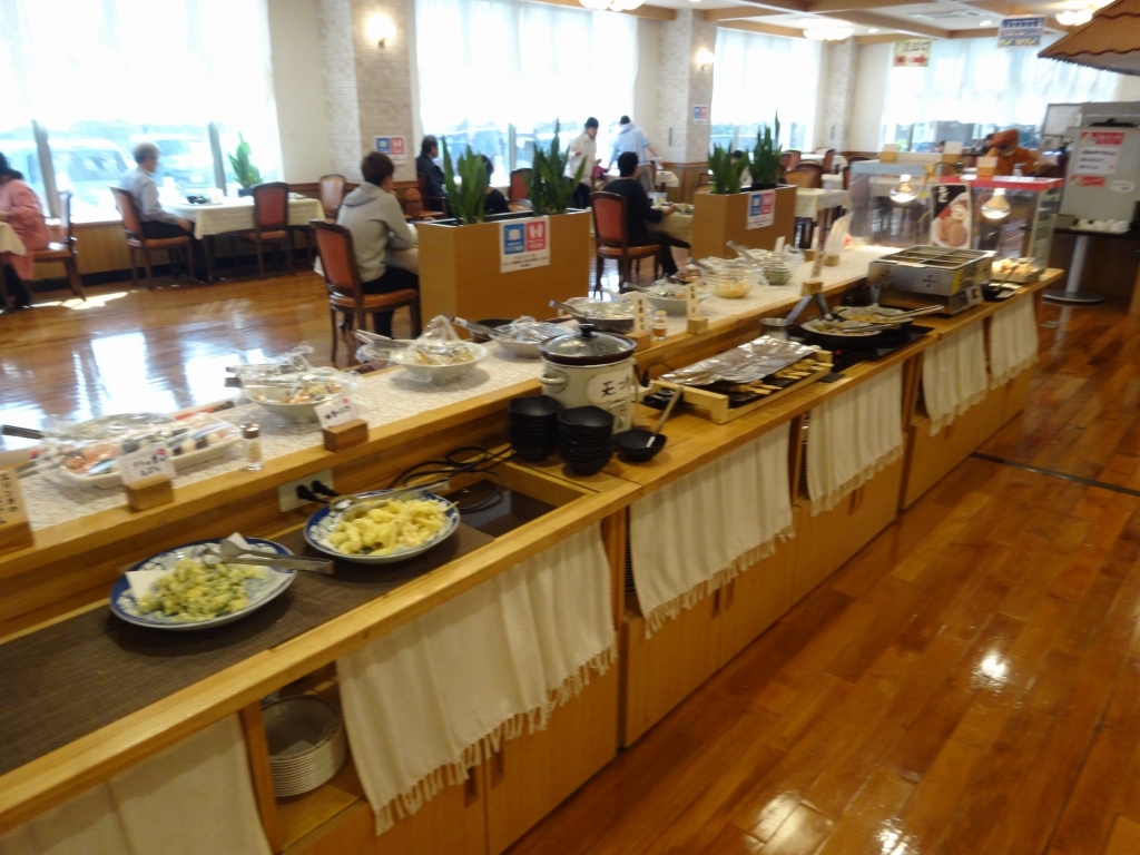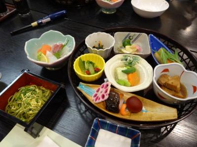 夕食は、2階のお座敷で籠の御膳。花籠御膳プラン(入浴込み3千円)並みの内容で、ボリュームもありお腹いっぱいになりました。朝食は和食のみ、昼食はバイキングです。