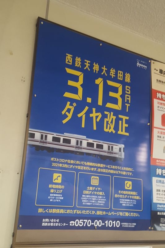 2021年春のダイヤ改定は、各地の鉄道で終電繰り上げとなります。西鉄電車も例外ではなく、平日0時の花畑行き急行電車が廃止となり、23時35分の筑紫行き普通が最終です。郊外にお泊りで、天神・中洲で飲もうという場合にはご注意を。