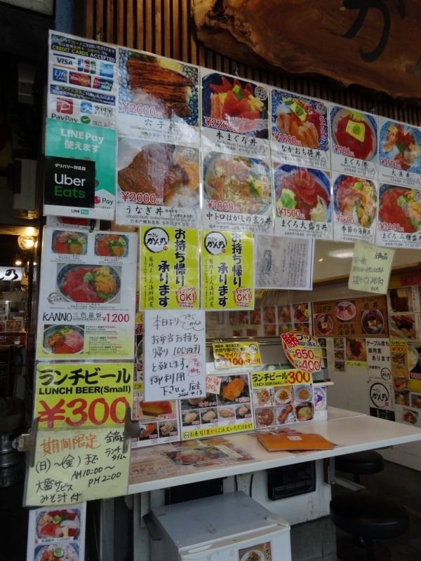 コロナの影響が抜けやらぬ2020年5月、築地場外市場の道路側の「かんの」は頑張って店を開けていました。新しい生活様式に対応すべく、テイクアウトに注力。500円のお弁当を売ったり、海鮮丼のテイクアウトは100円引き(容器代100円プラスにあらず!)にしたりと、頑張っておられました。