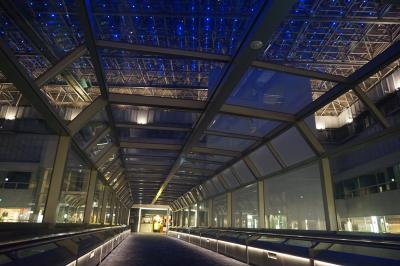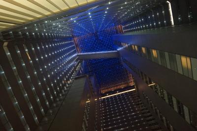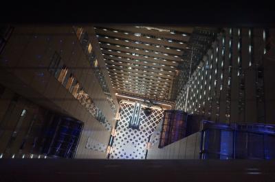 新宿西口の高層ビル群の一つ。展望エレベーターの速度は早く、あっという間に地上が遠ざかっていきます。ビル中央は吹き抜けになっており、そこに掛かるブリッジは迫力満点。