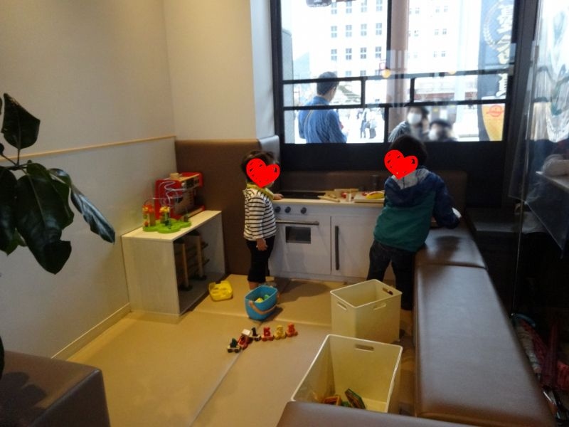 店内にはキッズスペースもあり、トイレのおむつ替え施設も充実。特におむつ交換台だけでなく、フィッティングボードも備えてあったのには感心しました。