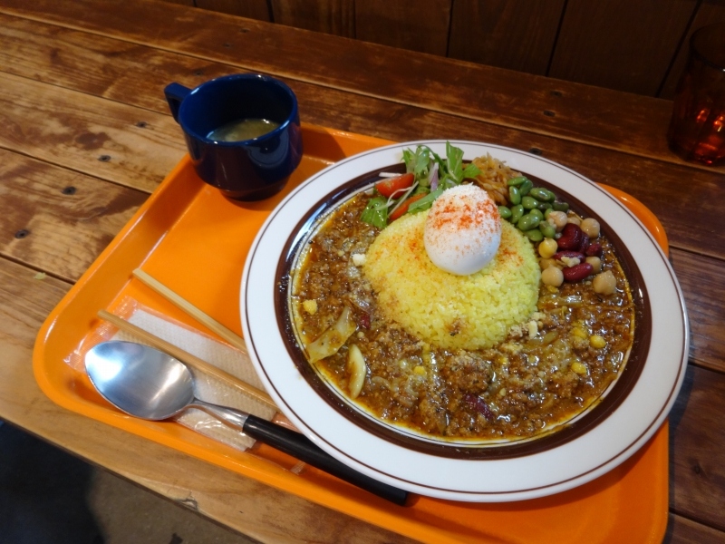 大村湾を望む素晴らしいロケーションにある千綿駅。駅舎内は、カフェレストラン「千綿食堂」になっています。この日の日替わりランチのカレーはキーマカレー。ふんわり卵がよく絡み、辛さがほどよくておいしかったです。