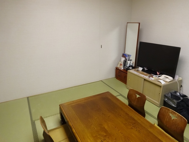 部屋の雰囲気はアパというか、ビジネスホテルらしからぬ純和風。ベランダは庭園風にしつらえてありました。真上の階には大規模な研修室があるらしく、講師控室を兼ねているのかもしれません。