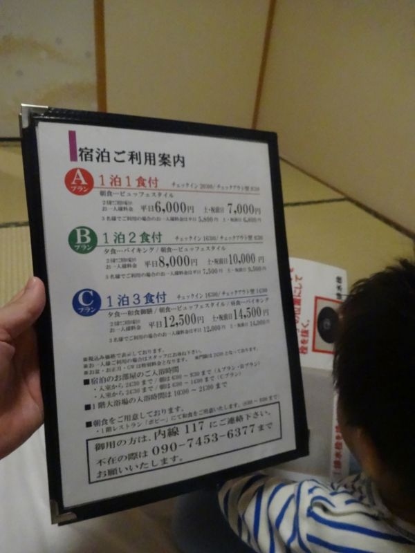 家族湯は畳敷きの休憩室付きで、なんと宿泊もOK! バイキングの夕食と朝食まで付いて8,000円(休前日は1万円)という良心的な価格です。昼間の家族湯は部屋の広さによって値段に差がありますが、泊りは一律料金なので早いもの勝ち。