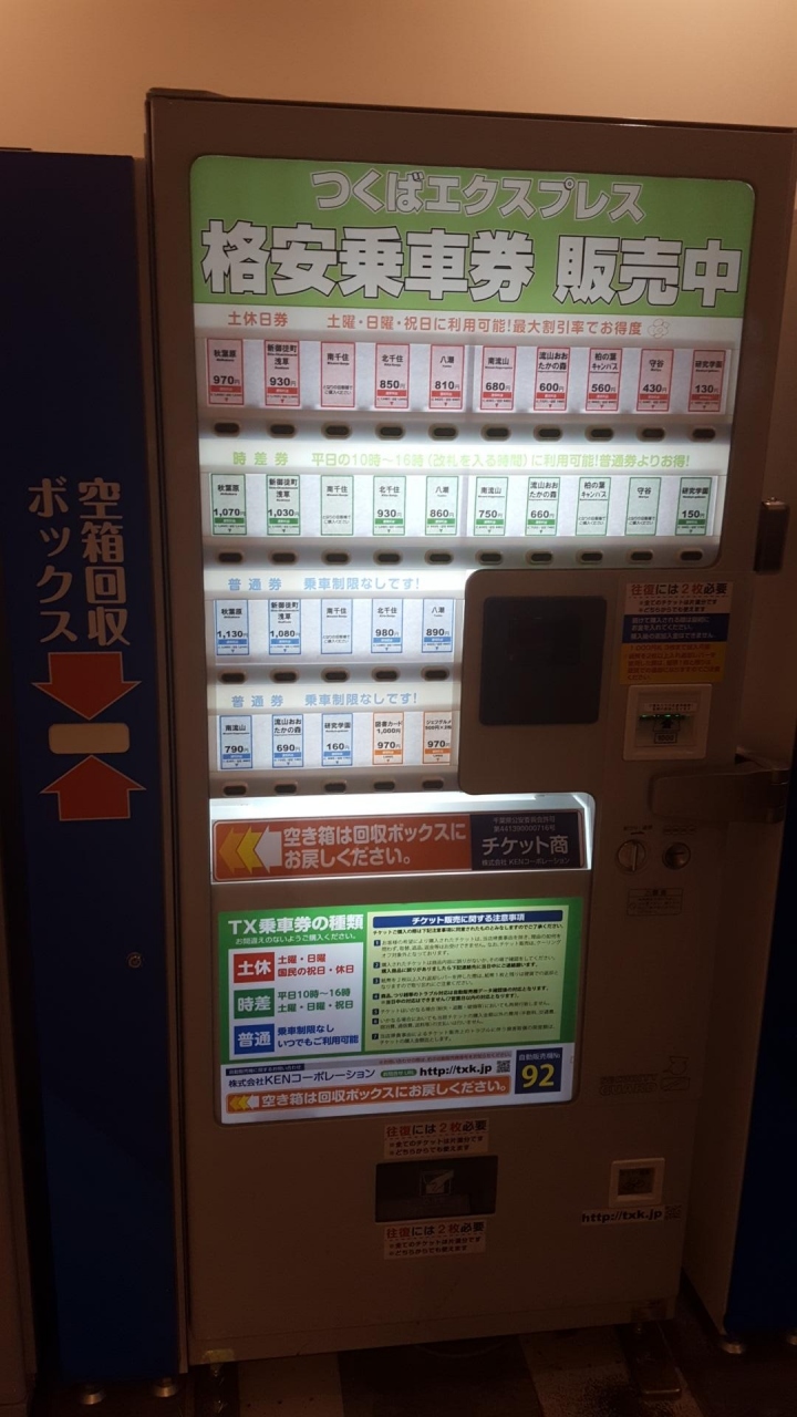 秋葉原からつくばまで、わずか45分で結ぶ私鉄電車。つくば市内には駅前はもちろん、いろんな所に回数券の自販機があり、時間に余裕があれば買い求めておくのが安く利用するポイントです。特に土休日には割引率が上がり、つくば~秋葉原間で1,000円を切ります。