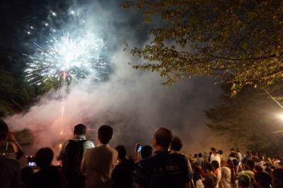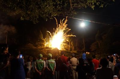 そして午後8時過ぎには、いよいよ花火動乱蜂が始まります。仕掛け花火が仕込まれた「蜂の巣」に火が放たれると、まさに花火が乱れ飛び!狭い谷間に鳴り響く轟音はすごい迫力でした。