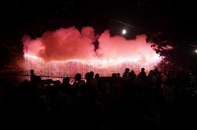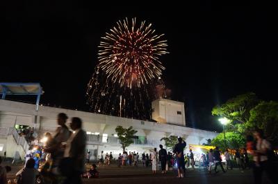 まずは通常の花火大会のような、仕掛け花火と打ち上げ花火の競演から始まります。そんなに大きな花火ではないけど、間近で打ち上げるのでかなりの迫力です。1発1発の花火の提供者を全部読み上げるので、花火と花火の間の時間はかなり長めです(笑)。