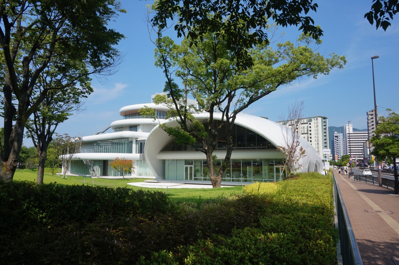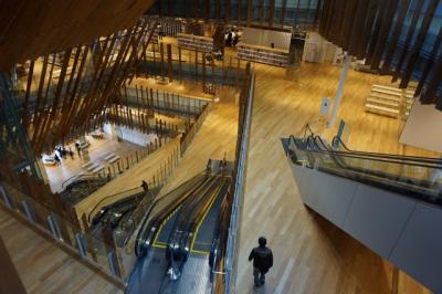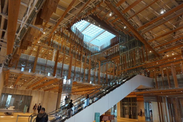 医学系の図書が充実した市立図書館、ガラス工芸品を展示したガラス美術館など見るべき内容は多い施設ですが、やはり建物そのものが見どころでしょう。斜めに抜けた木とガラスの吹き抜けは圧巻で、フォトジェニックです。