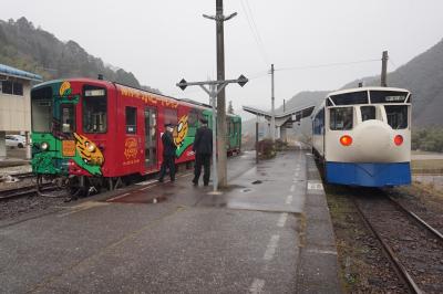 さらに江川崎駅では、兄弟分の観光列車「海洋堂ホビートレイン」とすれ違い、海洋堂も10分停車するので、車内見学までできちゃいます。