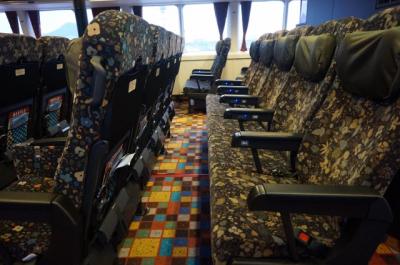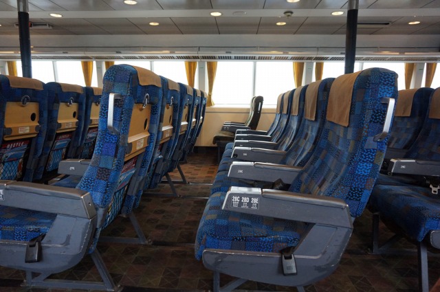 一方の船体リニューアルでは、各座席にイヤフォンジャックを設置。ちょうど3時間の航海で1編見られる船内映画も、従来の字幕ではなく、音声で楽しめるようになりました。乗船の際には、イヤフォンをお忘れなく。USBポートも付いたので、電子機器の充電も可能です。