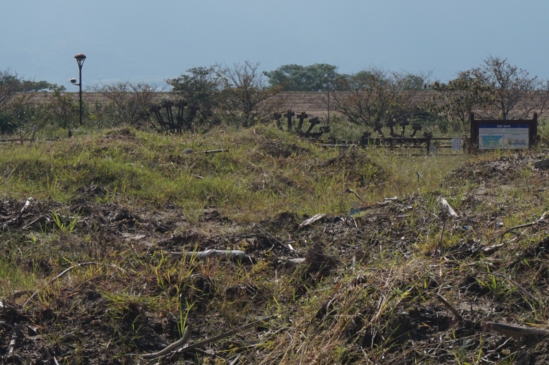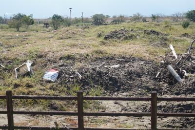 道の駅自体も被災しており、道の駅そのものはすっかり復旧されたものの、南側の公園は土砂が流れ込んだまま。三連水車のレプリカは止まり、バス停が流されてきていて、災害の恐ろしさを見せつけています。