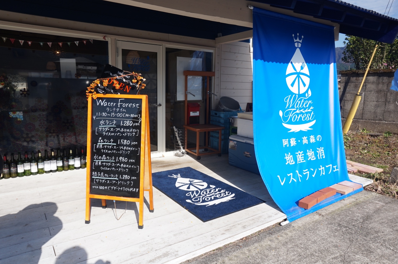 2015年にオープンした、湧水トンネル公園そばのカフェレストラン。おしゃれな建物は、農産物直売所をリニューアルしたものだそうです。南阿蘇の地の農産物を使ったランチを味わえます。水のおいしさも、料理の味を引き立てます。