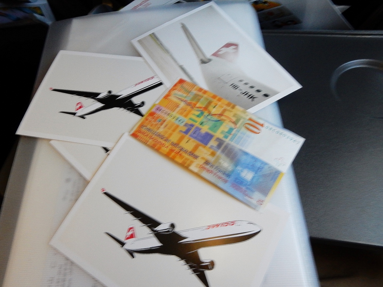 スイスフラン紙幣で支払うので、切手の購入と絵葉書の発送をキャビンアテンダントへ依頼。
