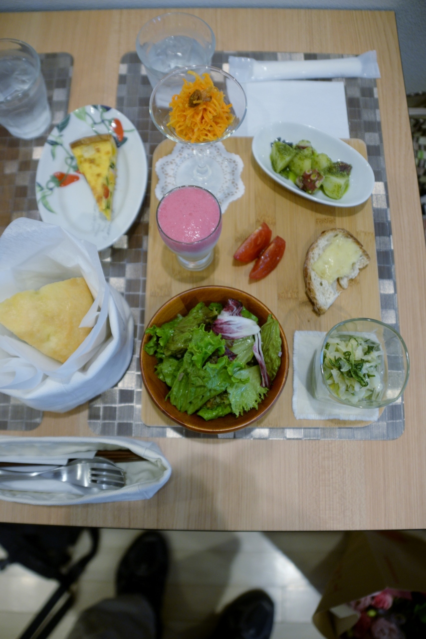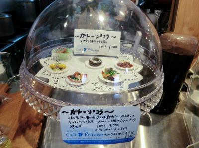 カフェ プリムールに12:35に入ったところ、他には客なし。頼んだのは、私は「本日のカレーランチ(サラダ+アイスコーヒー付)」妻は「よくばりランチ キッシュ1/2カット+アイスティー+ウィークエンド(無農薬パウンドケーキ)付き」。