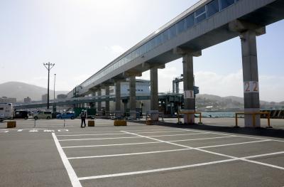 フェリーターミナルで、大型貨物が一台も乗船待ちしてないのは初めて見た。ところが大函丸は乗船口が高さ4m以上あり、十分大型貨物トラックの収容が可能である。何故だろう。