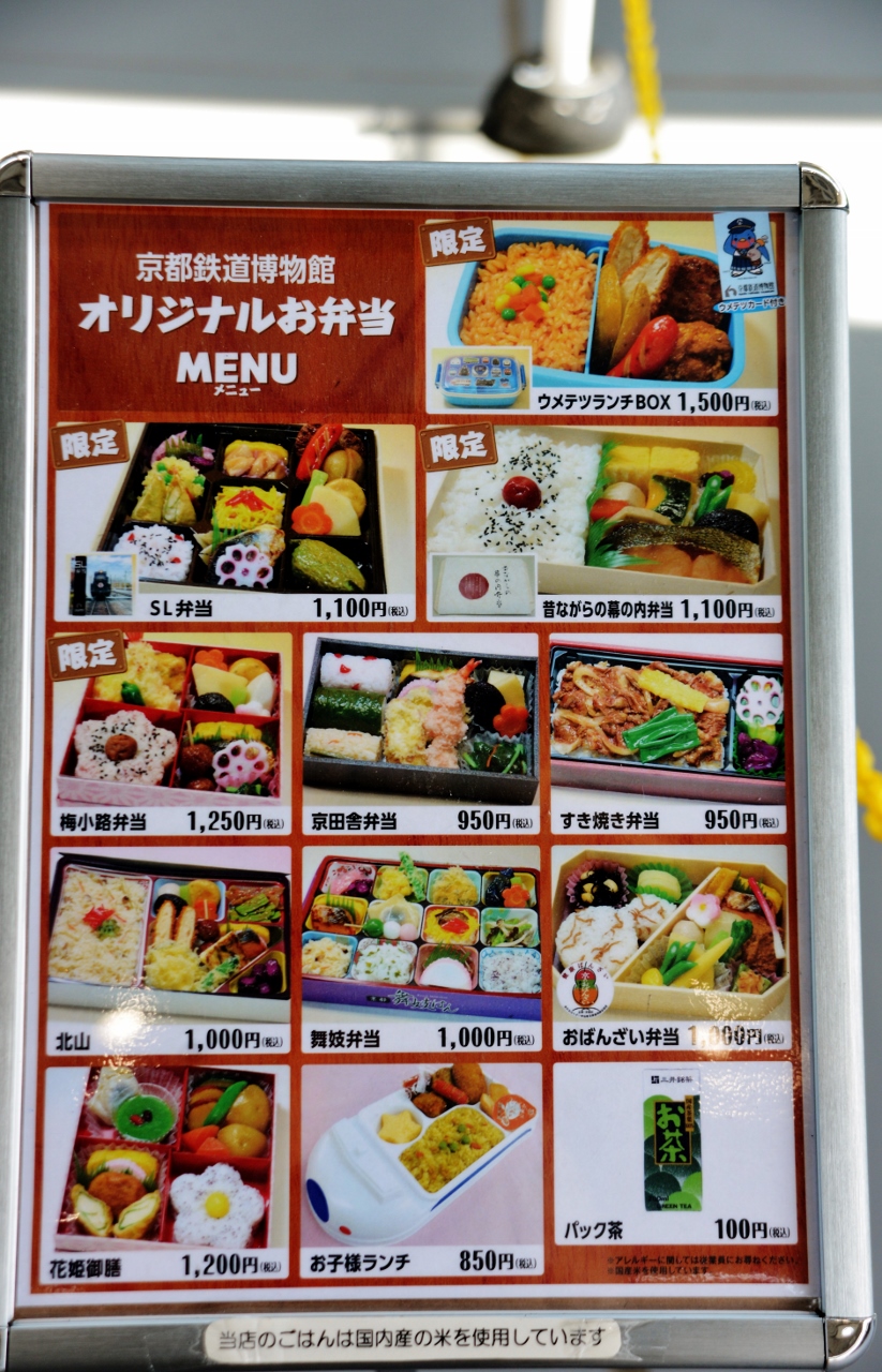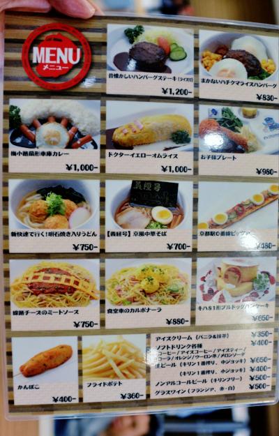 梅小路扇型車庫カレー、ドクターイエローオムライス、新快速で行く!明石焼き入りうどん、[義経号]京風中華そば、京都0番線ピッツァ、線路チーズのミートソース、食堂車のカルボナーラ、キハ81型ブルドックハンバーグ、かんぼこ。名前を聞いただけでは何が出てくるのか、食欲が決して沸いてこない名称である。孫はどのメニューを選ぶだろうか。