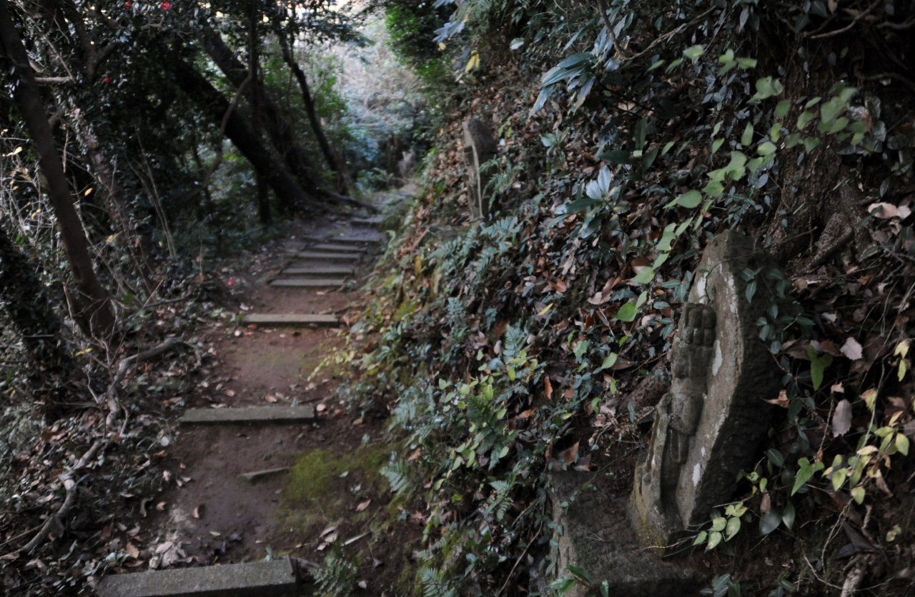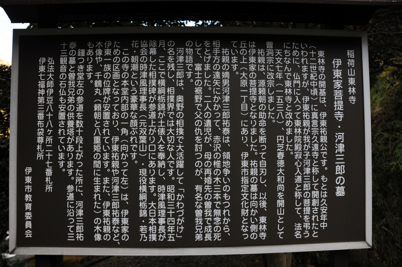 音無神社では、伊東祐親が京に赴任中、流人源頼朝が伊東祐親の娘八重姫との間にもうけた千鶴丸の運命を知り、葛見神社では伊東氏の先祖について知り、伊東祐親の菩提寺である東林寺では、本堂の一角に伊東祐親や千鶴丸の木造が安置され、伊東祐親や河津祐泰等の位牌があるはずである。実際に訪問した際には余りにも暗くてどれがどれだか分らなかった。次に東林寺南側に小高い山があり、山の頂上付近には河津三郎の墓と曽我兄弟の墓といわれるものがある。この墓への参道入口には、相撲四十八手の一つ「かわづがけ」の創始者として名高い、曾我十郎祐成と曾我五郎時致の兄弟の実父である伊東祐親の嫡男・河津三郎祐泰の記念碑がある。参道には多くの観音像があり、江戸時代の山道を歩いているような感じとなるが、老人にはかなり急な坂道であり、推奨しない。曽我物語の発端は、伊東祐親との領地争いによって、祐親を深く恨んでいた工藤祐経は部下に命じて、伊東祐親を遠矢で殺そうとしたが河津三郎祐泰に当たり、河津三郎祐泰は落命する。河津祐泰の子祐成(元服後十郎祐成)と時致(元服後五郎時致)は母が曾我祐信と再婚したことから曽我姓を名乗る。1193年5月源頼朝は、富士の裾野で盛大な巻狩を開催した。巻狩には工藤祐経も参加していた。この機会に、曽我兄弟は工藤祐経を討ち果たすこととなる。