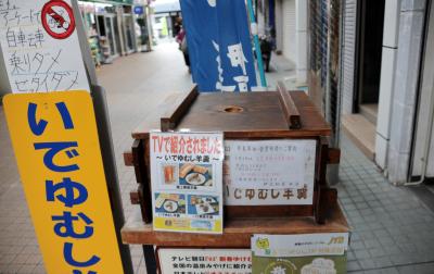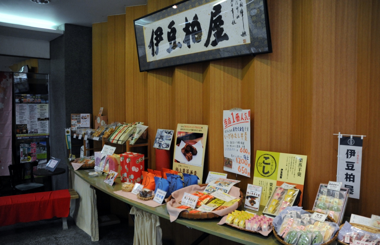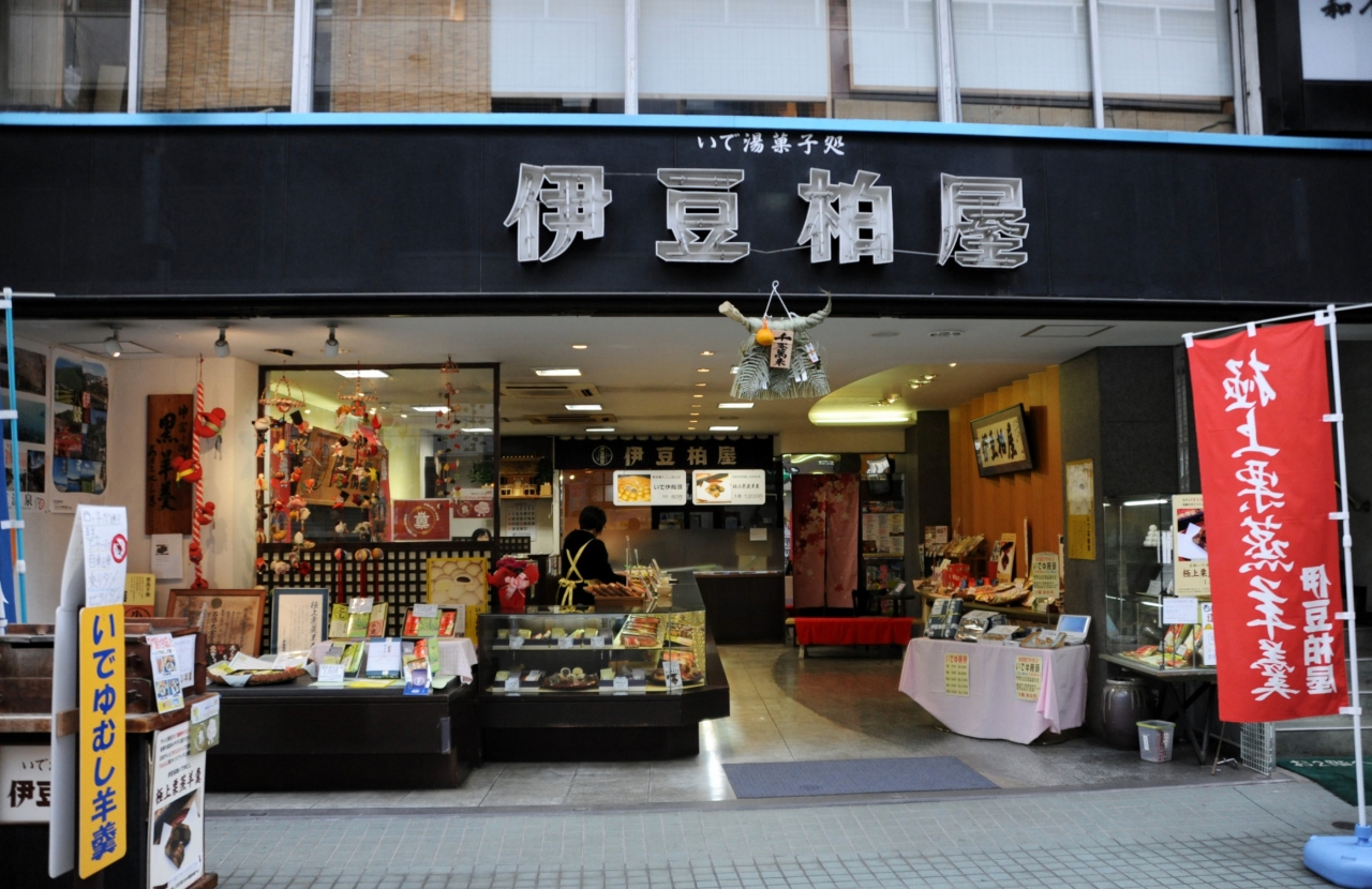 映画館が一軒もないキネマ通りアーケード内を昼飯を食べようと散歩していたところ見つけたのがここ「いで湯菓子処 伊豆柏屋 」。何せ、おなかが空いてたので、試供品の「いでゆむし羊羹」を四切れをいただいてしまった。本物の竹皮に包まれており、あまり甘くなく、美味しいので、特に推奨する。値段は一包装600円。他にもいろいろな菓子があったが試供品食べて味が保証できるのはこの「いでゆむし羊羹」だけである。