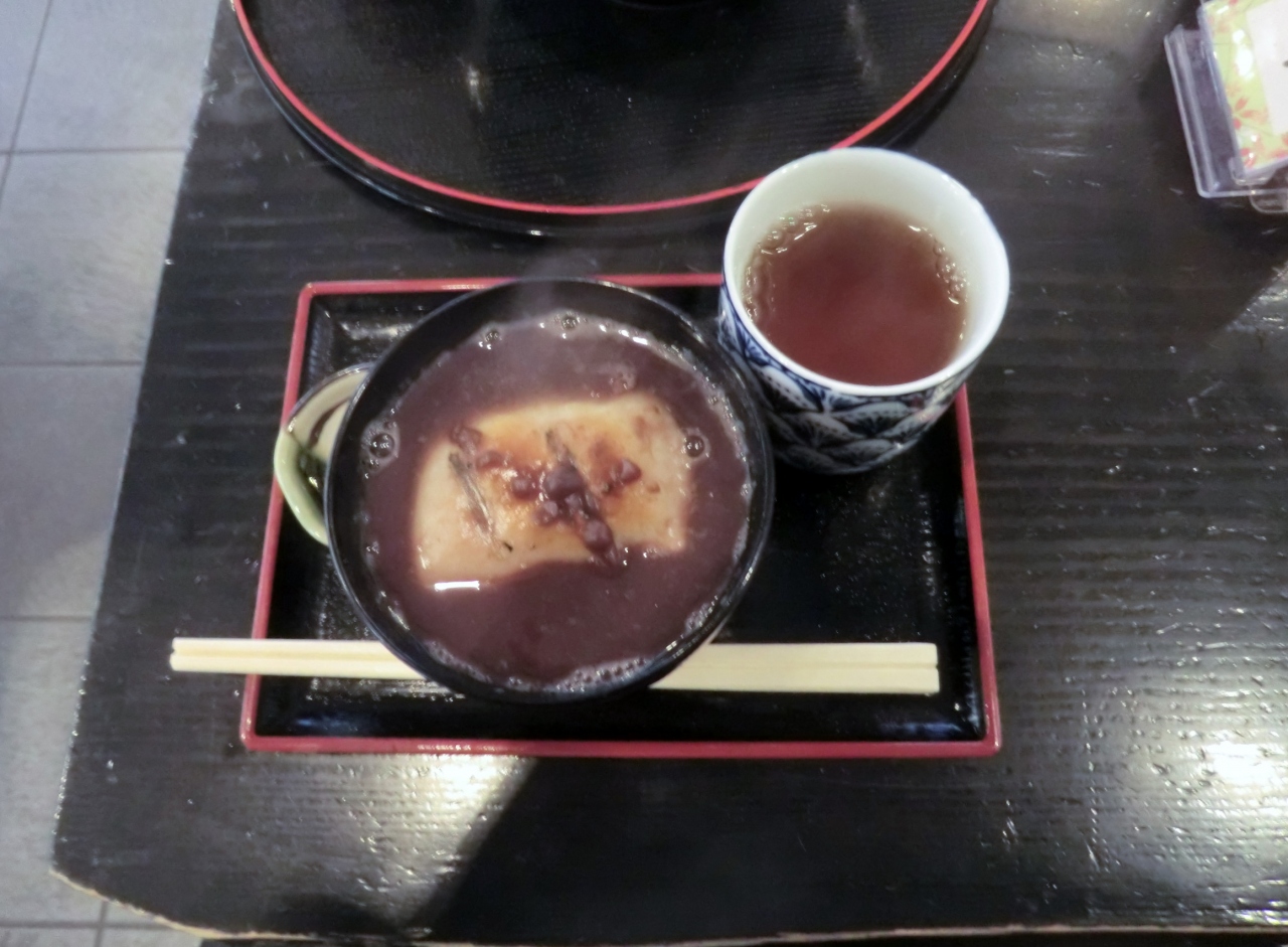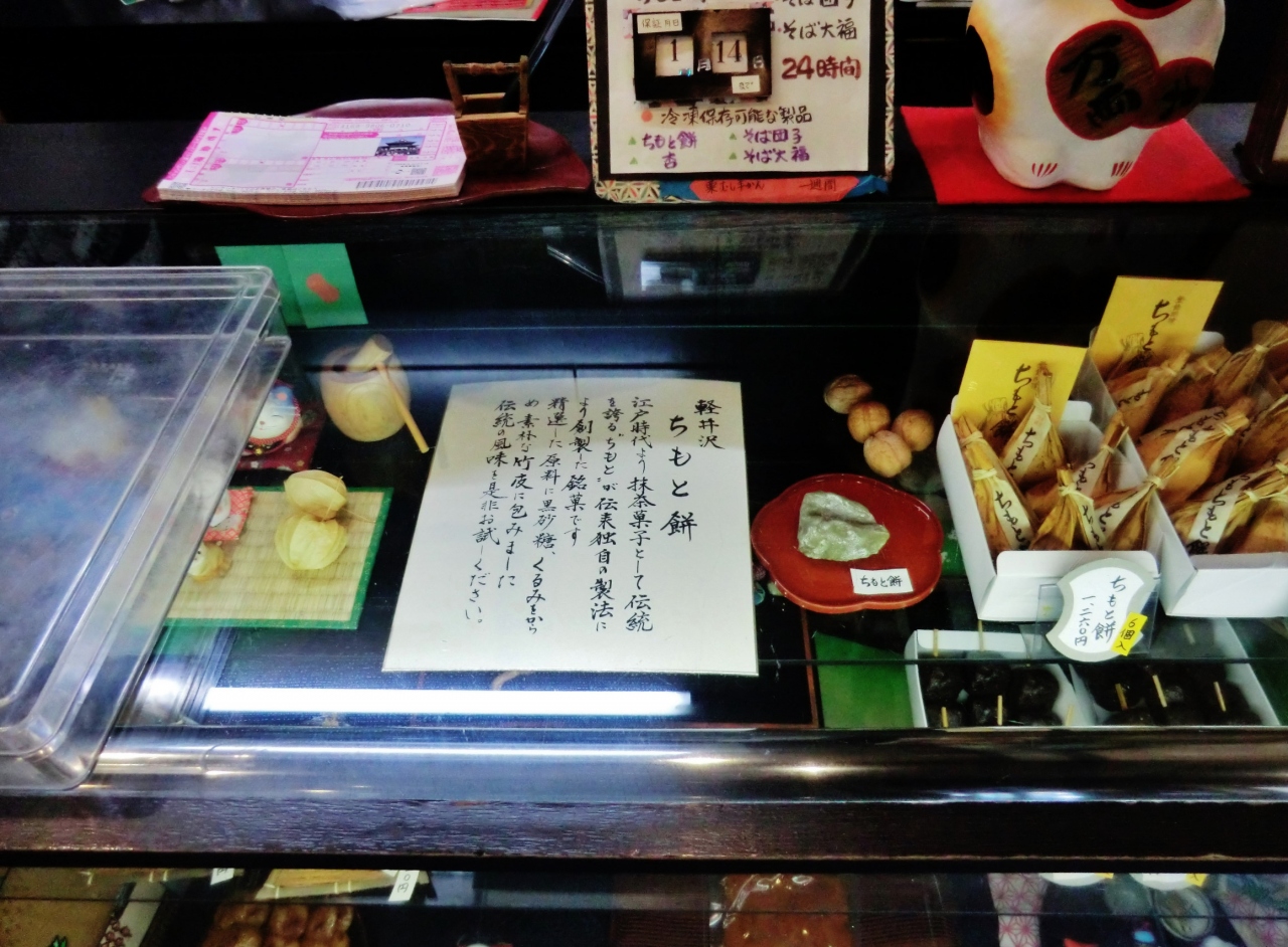 妻は山菜そば。私はしるこ。外は肌寒いため暖かいものが最適。値段はそこそこするが、冬場は軽井沢では多くの店が春まで店を閉めているため、店を開けてくれているだけで感謝感激。店の内装は黒い柱で統一されており、外国人観光客向けか。帰りにちもと餅を購入し、後で食べたら柚餅子のような食感であった。店の女主人の話では、昔は江戸で和菓子屋をやっており、ここ軽井沢に移ったとのことである。