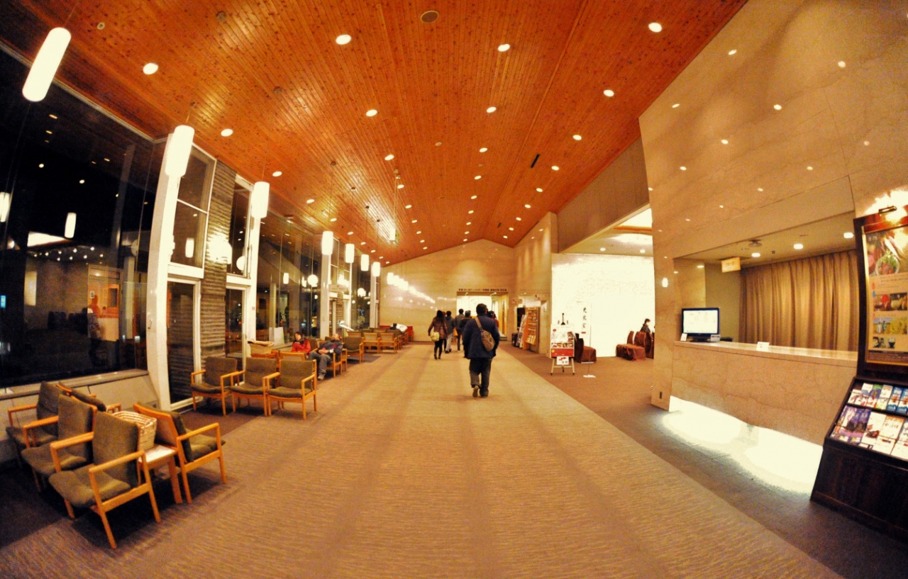窓越しには屋外の風景がよく見えるが一月三連休は暖冬で雪がなく秋のようであった。- 旅行時期