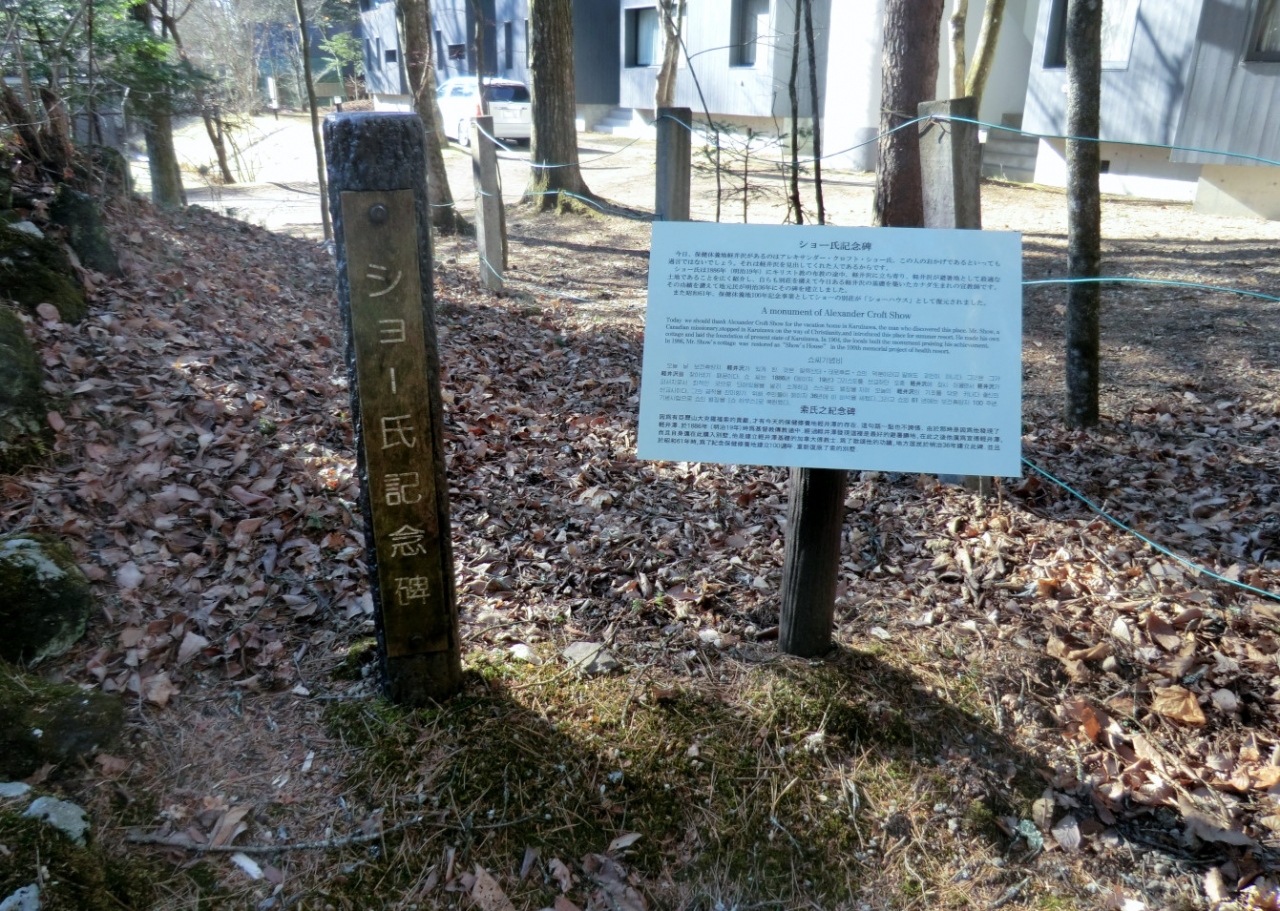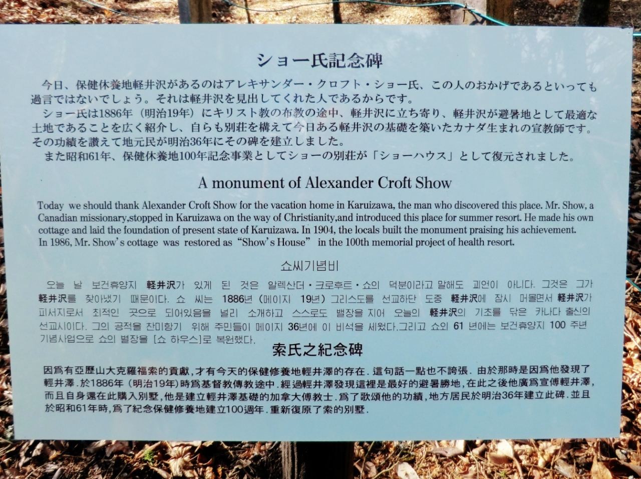 どこかでショーの名前を聞いたことがあり、思い出したのが、ブラタモリ「軽井沢はなぜ日本一の避暑地になったか」。軽井沢が避暑地になったのは宣教師達の貢献が大であるとのことである。特にアレキサンダー・クロフト・ショー氏の貢献が大である。記念礼拝堂は木造で、シンプルで周囲の林の中に溶け込んでいる感じがした。- 旅行時期