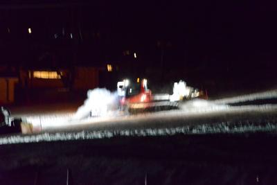 暗闇の中で良くわからなかったが、スキー場の山の上からスロープの中ほどまで3-4台の圧雪機と思われるキャタピラー車が轟音をあげて動いていた。