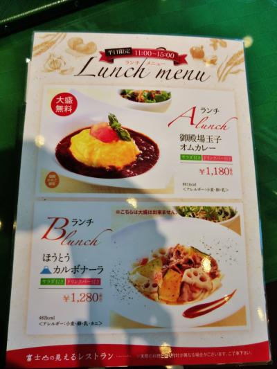 昼食時に座ってゆっくり昼食とコーヒーが飲みたくて入ったレストラン。入口には「富士山の見えるレストラン」と表示されている。店内に入ったのは午後2時近くである。富士山は朝早い時間は晴れていれば全体が見えるが次第に雲がかかり、富士山は見えなくなる。この日は富士山は頭だけ雲に隠れていたがすそ野はよく見えた。昼食はAランチ1180円が最も安くお勧めである。量も老人には十分である。
