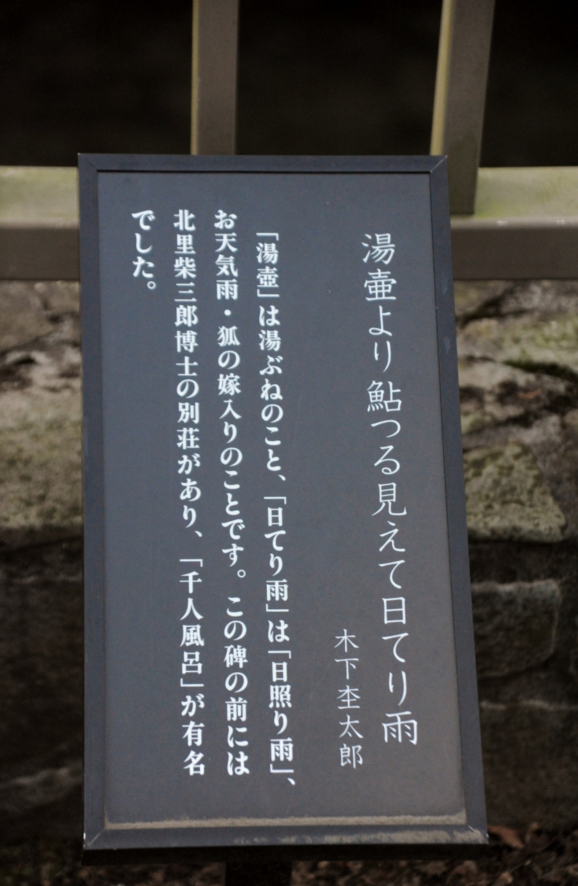 西小学校へ通学するのに川を渡る適当な橋がなかったので、近くに別荘があった北里柴三郎が寄贈した。この由来から「通学橋」と呼ばれる。現在は、三代目の橋で補修中、通学橋の名称は見えない。北里柴三郎がこんなところに足跡を残しているとはしらなかった。- 旅行時期