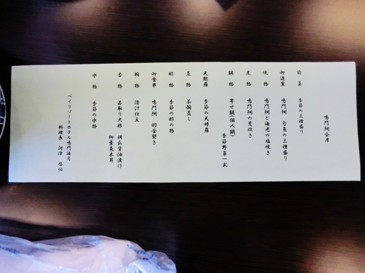 四国中国地方瀬戸内海沿岸の旅の出発帰着点を徳島空港として、ここ鳴門市ベイリゾートホテル鳴門海月に一泊した。この際、チェックイン日が大潮の発生日であるため、6.a-eでうずしおを見学した。チェックイン日には大塚国際美術館も見学した。