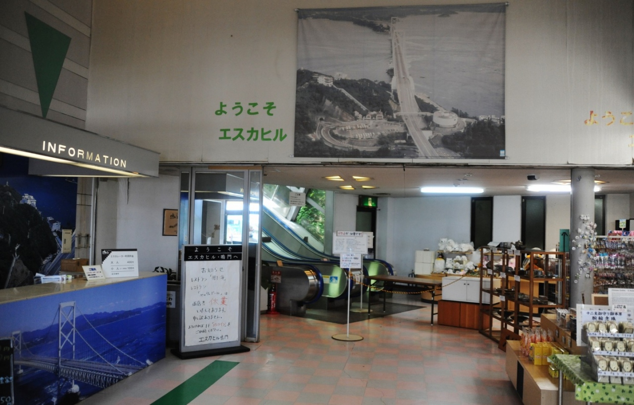 ロープウェイの入口近くのうどんやで聞いたら、ロープウェイ頂上駅を出て右側にあるとのことであった。ロープウェイ頂上駅の係員に聞いたら、わざわざ電話をかけて確認してくれた結果、ロープウェイ頂上駅を出て右側だったのは確かであるが現在工事中であるとのこと。確かに現在、道路を新設中で入れない。