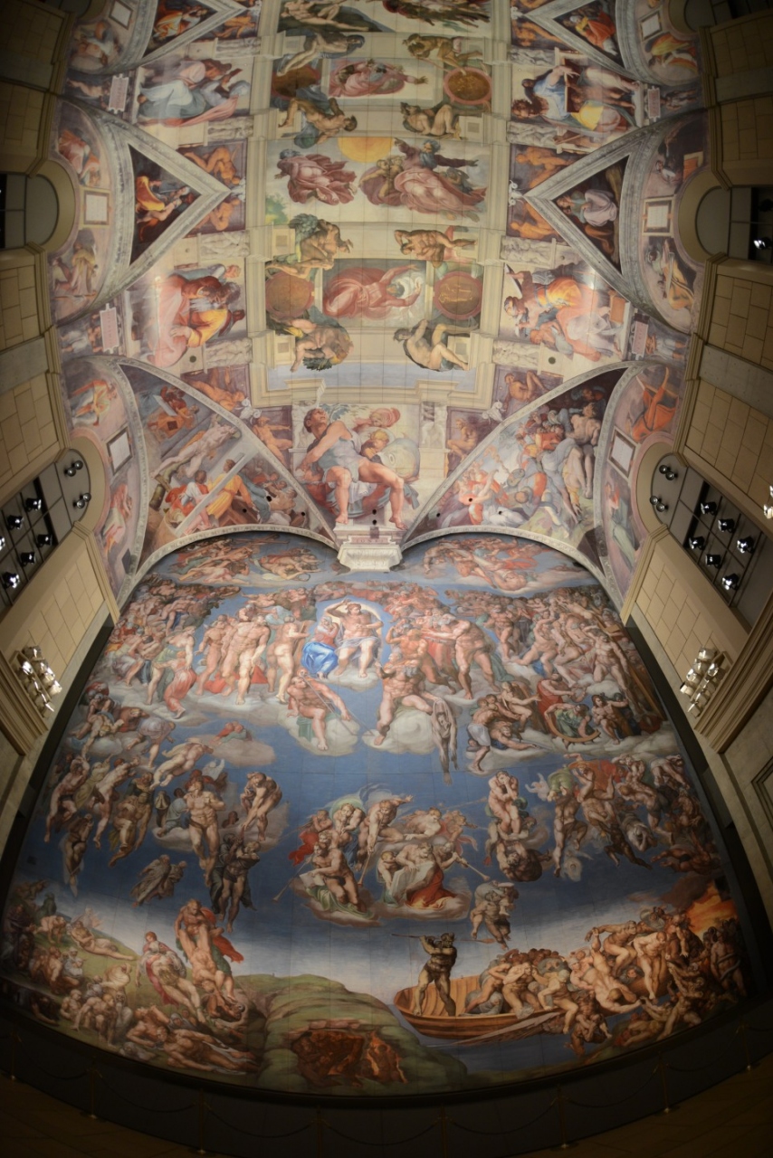 特に、本物のシスティーナ礼拝堂では天井画を見るために立ったまま首を曲げて見上げなければにらないので疲れてすべての天井画をじっくり見ることができなかった。ここではベンチが用意されており、座りながら、時間の許す限りゆっくり、じっくり鑑賞できる。